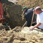 is men bezig met de afwerking. In de St-Amandusstraat worden klinkers gelegd, in de Waterstraat worden de kanten vlak gemaakt om nadien gras in te zaaien. Als alles mee zit zullen de