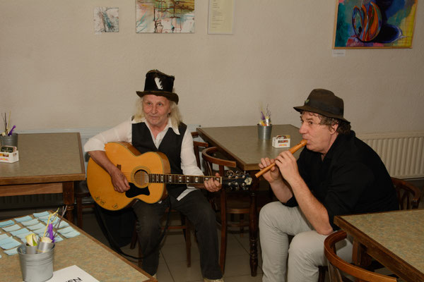 versterking gekregen van Salvo met zijn mandoline, fluit en accordeon. Met tussenpozen speelden zij aan alle tafels vele bekende en minder bekende melodietjes en dit tot in de vroege