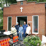 Romain en André kunnen dankzij de stellingen van dorpsgenoot Raymond Bruyninx de binnenkant van de kapel een fris kleurtje bezorgen. Buiten is Gaston aan het lassen: het ijzer hekwerk dat in
